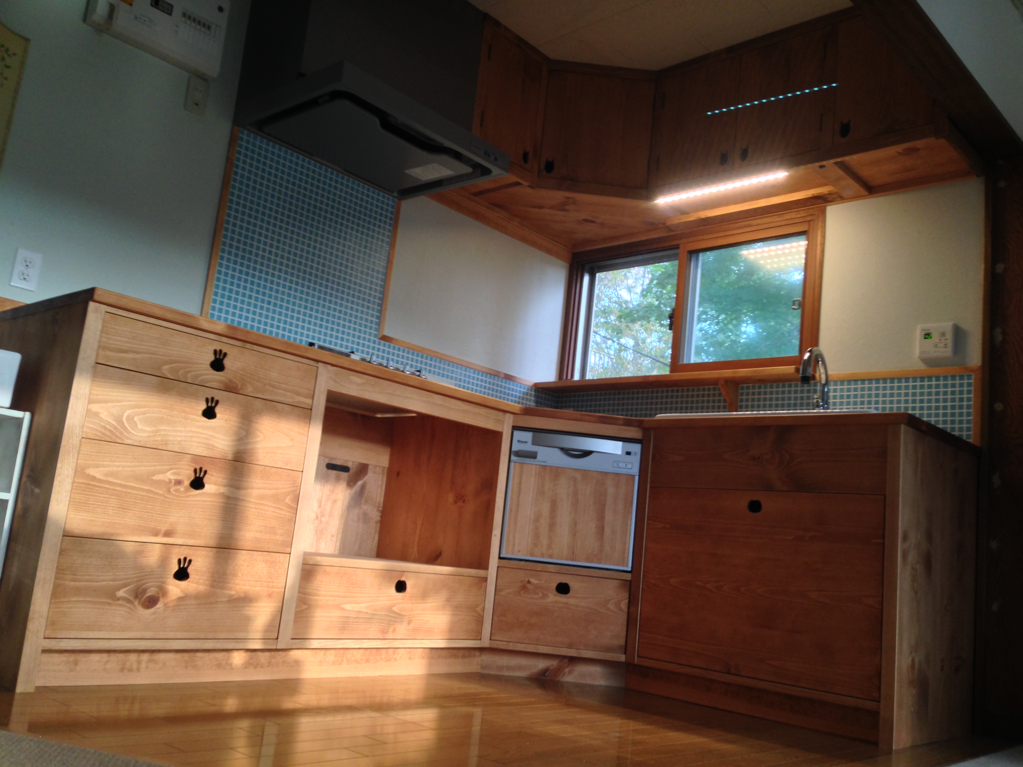 引き出しの引き手用穴が カワイイL型キッチンです コーナー部分のデットスペースに 食洗機をはめて使い安く 引き出しの引き手の穴がキャラクターのシルエットに 水色のタイルも可愛いです タイルもCARO施工でキッチンとの納まりも きれいに収めました 吊り戸棚にはLEDの照明つけて 夜も手元明るいですね