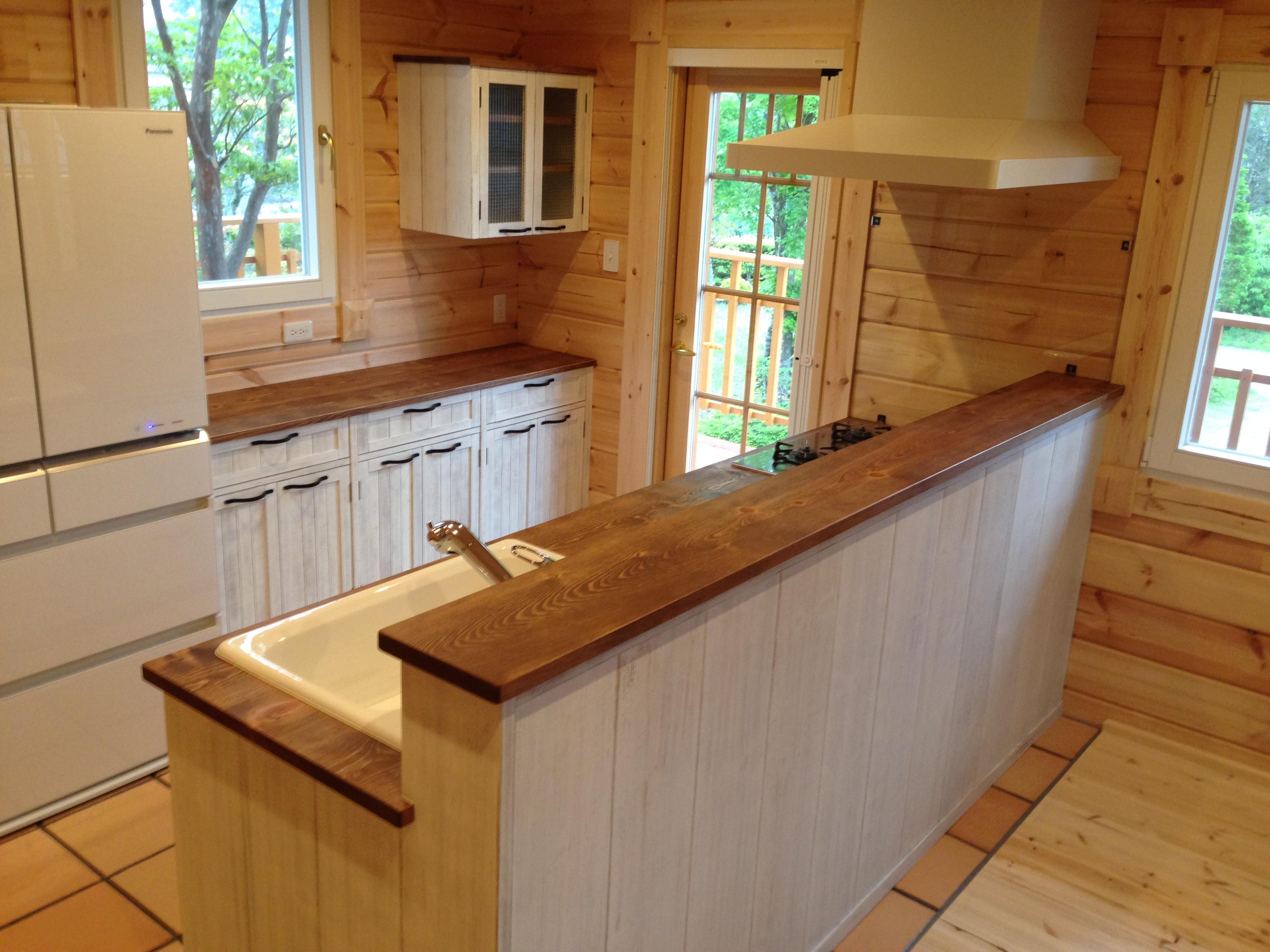 キッチン アンティーク仕上げのホワイトがアクセント アイアンハンドルも似合います。