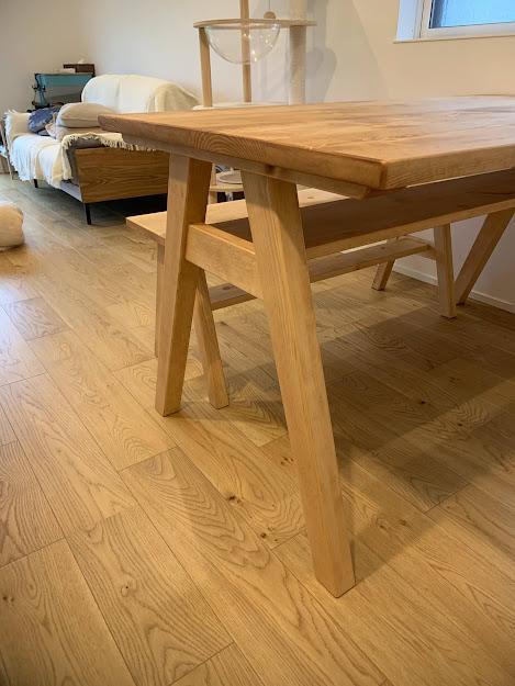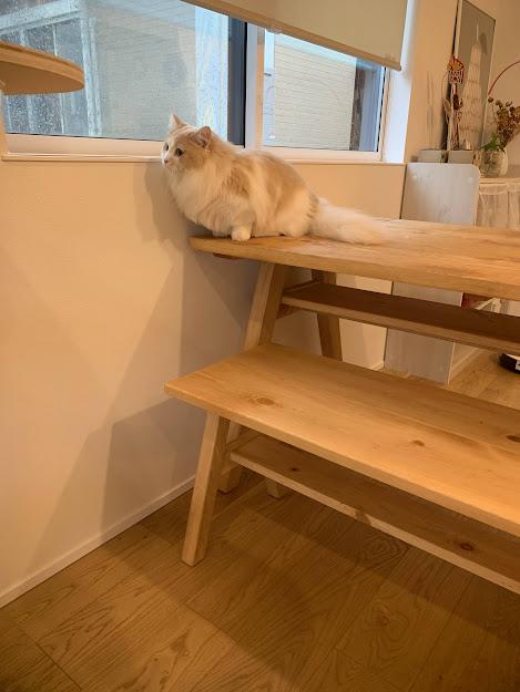 ハの字脚のテーブルです 真ん中に棚がありティッシュペーパーなど 置けて便利です。 ネコちゃんにも気に入っていただけたようです。